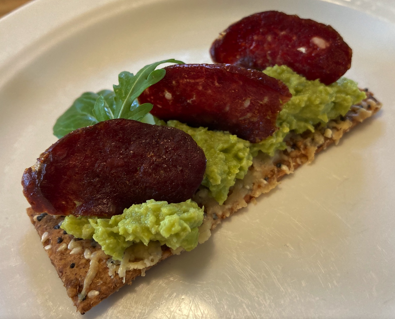 Det finns så mycket lokalt producerad chark nuförtiden. Chark av vilt är smakrikt och vildsvin är något som numera finns i stora delar av landet. Vi har förmånen av att ha en superduktiga charkuterist på nära håll som hjälper oss göra utomordentligt god ölkorv av vildsvinskött. Men det går lika bra med vilken annan ölkorv som helst. Jag väljer att torka tunt skivad ölkorv en stund i ugnen på bakplåtspapper. Då blir de än mer intensiva i smaken och så där härligt krispiga.